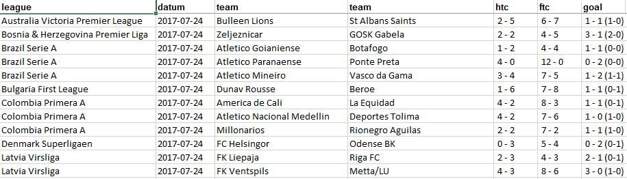 You can export FT/HT corner info and FT/HT goal info to Excel CSV format file. You can choose weekly periods. The newest week is downloadable only 1 week delay.